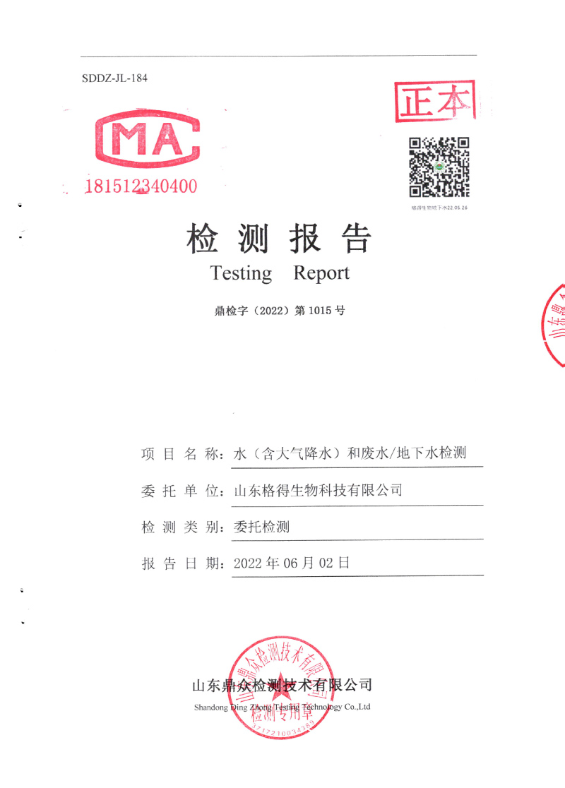 附件:山東格得生物科技有限公司2022年地下水檢測報(bào)告