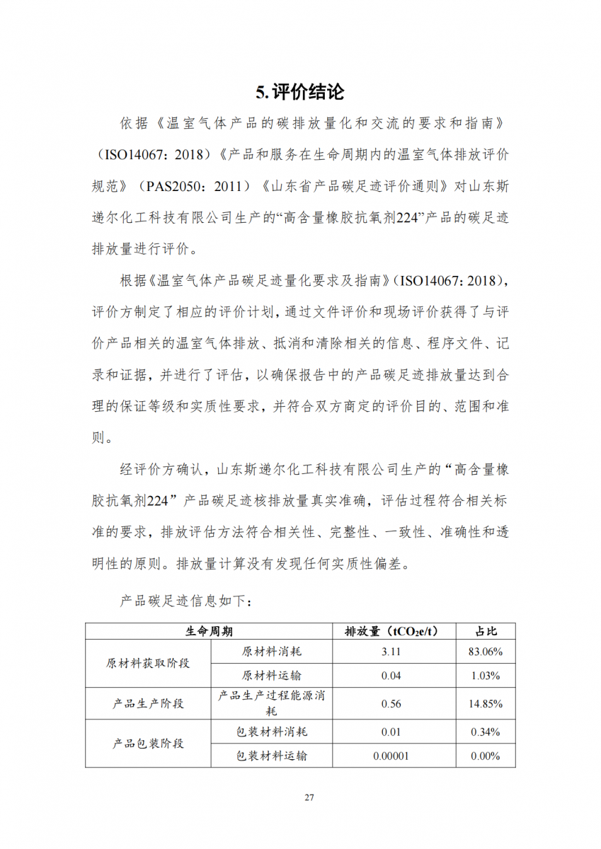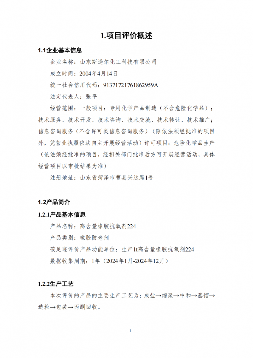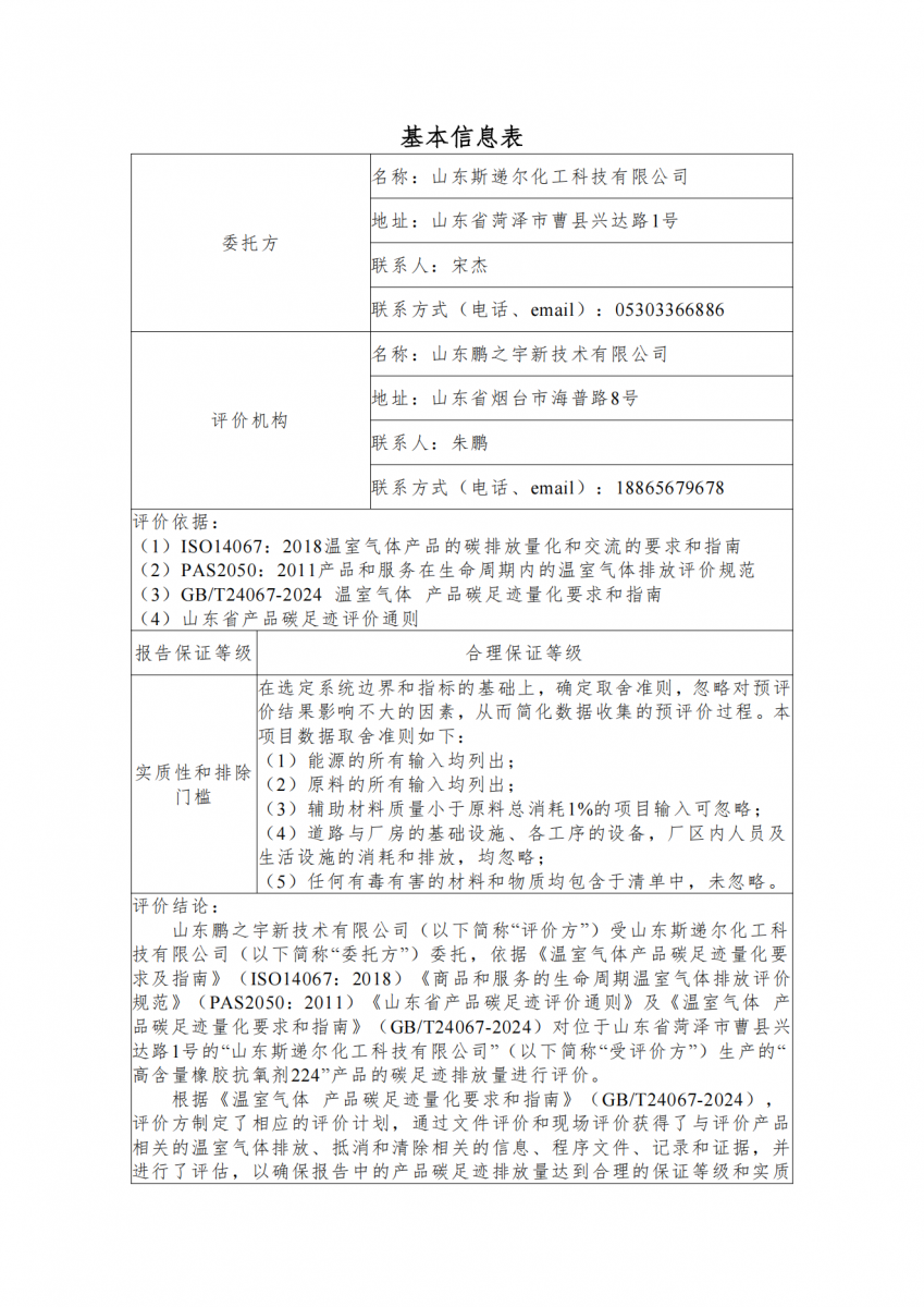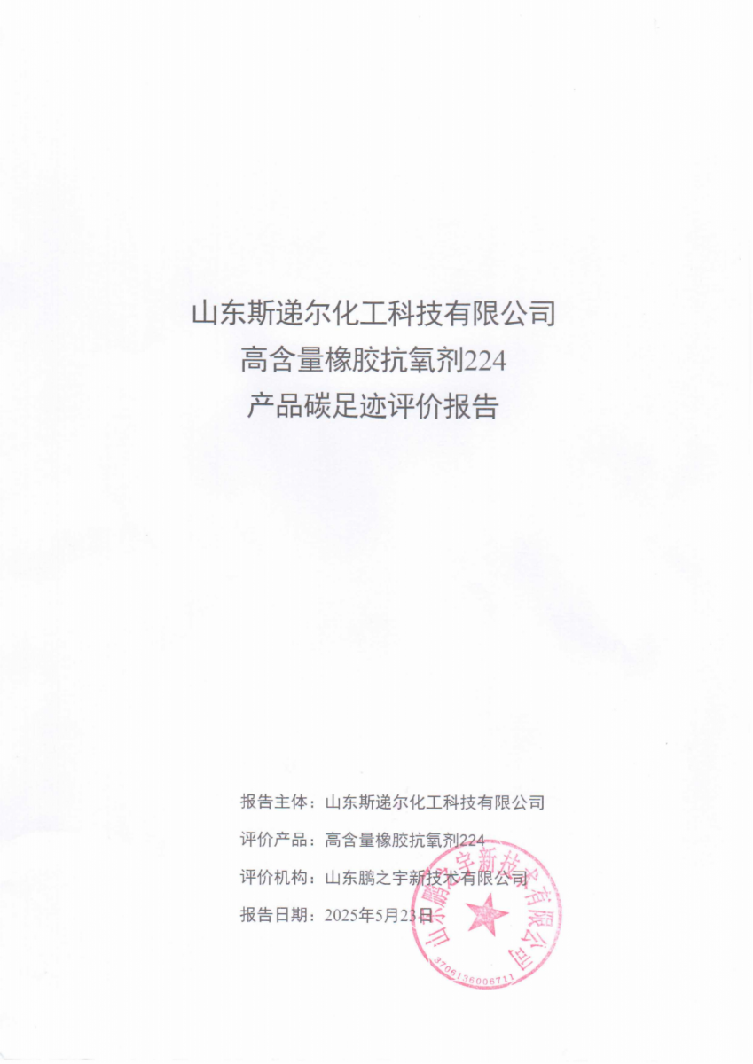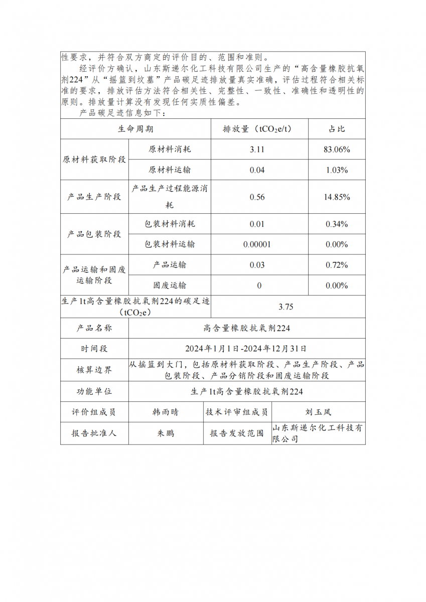 山東斯遞爾化工科技有限公司高含量橡膠抗氧劑224產(chǎn)品碳足跡評(píng)價(jià)報(bào)告